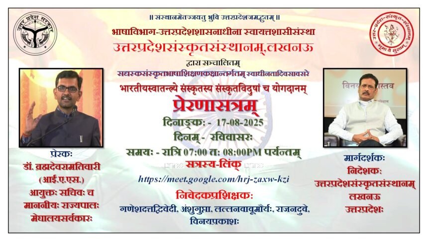 उत्तरप्रदेशसंस्कृतसंस्थानस्य निदेशकस्य श्रीविनयश्रीवास्तवस्य सानिध्येन प्रशासनिकस्य दिनेशकुमारमिश्रस्य प्रेरणेन योजना-प्रभारिणः श्रीभगवानसिंहचौहानस्य मार्गदर्शनेन च अधिपङ्क्ति ऑनलाइन-शिक्षणपाठ्यक्रमनिर्माणयोजनान्तर्गतानां संस्कृतशिक्षणकक्षाणां परतया “स्वाधीनतासङ्ग्रामे संस्कृतभाषायाः संस्कृतविदुषां च भूमिका” इत्यस्मिन् विषय उपरि प्रेरणासत्रमाचरितम्।