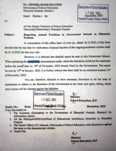 ज्ञातव्यं यत् २०२४ तमे वर्षे शिक्षाविभागेन निर्देशाः कृताः यत् विद्यालयेषु वार्षिककार्यक्रमाः नवम्बरमासस्य प्रथमदिनात् ३० दिनाङ्कपर्यन्तं भवेयुः। परन्तु अस्मिन् वर्षे बहवः विद्यालयाः एतेषां निर्देशानां अनुपालनं न कृतवन्तः। तदनन्तरं मंगलवासरे विद्यालयीय- शिक्षानिदेशालयेन सर्वेषां मण्डलानाम् उपनिदेशकान् प्राचार्यान् मुख्यशिक्षकान् च पत्रं निर्गत्य दिसम्बरमासे सर्वकारीयविद्यालयेषु वार्षिककार्यक्रमस्य आयोजनस्य दृढ़तया संज्ञानं गृहीतम्, परन्तु तदनन्तरं बुधवासरे निदेशालयेन निर्देशेषु संशोधनं कृत्वा विद्यालयेषु वार्षिककार्यक्रमं कर्तुं ३१ दिसम्बरपर्यन्तं शिथिलता प्रदत्ता।